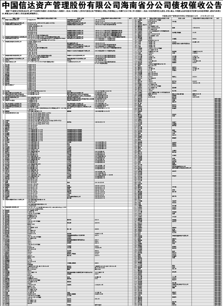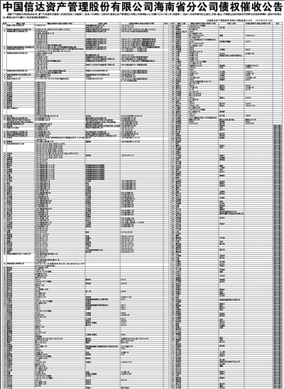 中国信达资产管理股份有限公司海南省分公司债权催收公告