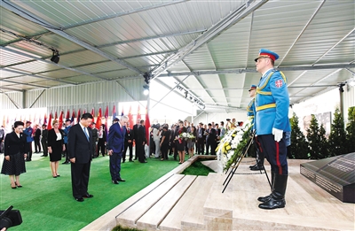当地时间下午4时30分许,凭吊仪式开始。军乐团奏响肃穆的乐曲,全场肃立。塞尔维亚礼兵抬花圈前行,习近平和尼科利奇缓步随行至纪念碑前驻足。塞尔维亚礼兵将花圈摆放至纪念碑前,两国元首一同趋前整理缎带。缎带上写着“深切缅怀邵云环、许杏虎、朱颖烈士”。全体默哀30秒。默哀毕,军乐团奏中塞两国国歌。国歌毕,彭丽媛、德拉吉察、戈伊科维奇议长、武契奇总理以及塞方全体内阁成员、中方全体陪同人员依次向纪念碑献花。