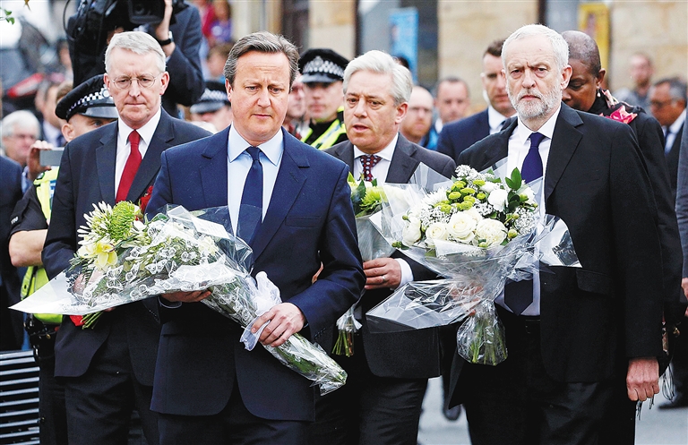 6月17日,在英国伯斯托尔,英国首相卡梅伦(左二)及工党领袖杰里米·科尔宾(右一)等政界人士出席悼念女议员乔·考克斯的活动。 英国西约克郡警察署17日说,警方正在“重点调查”刺杀英国女议员乔·考克斯的凶手是否带有右翼极端主义思想。新华社/路透