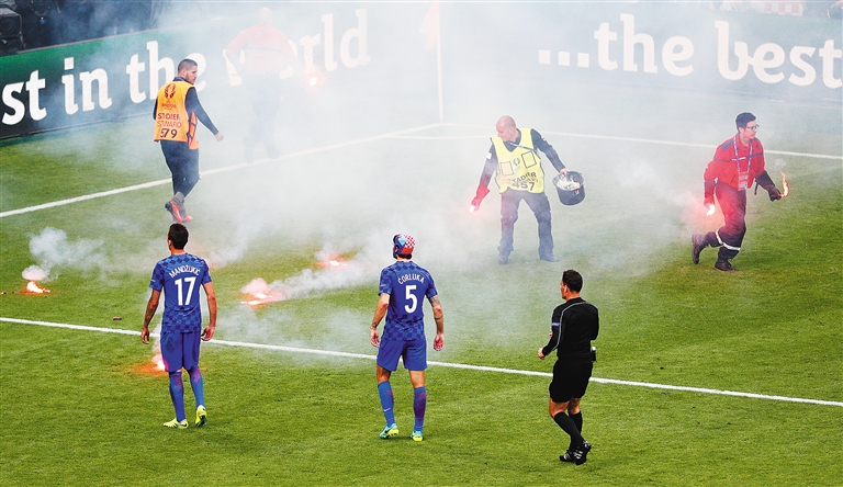 克罗地亚队在17日的比赛中2:2战平捷克队。比赛进行到第86分钟,至少有8枚焰火从克罗地亚球迷所在区域落入场内。在清理焰火的过程中,一名工作人员被其中一枚焰火炸到。