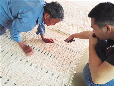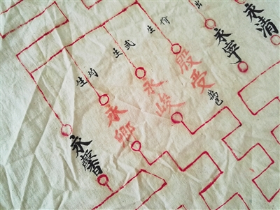在“殷受”的下方,还有两个小字“万包”,记者看得云里雾里,不明就里,经村老点拨,方知是这个叫“符殷受”的人没有儿子,由下一代中一个叫“万”的兄弟的儿子负责为其养老送终。细看之下,其名字底下果真没有连向下一代的红线条。