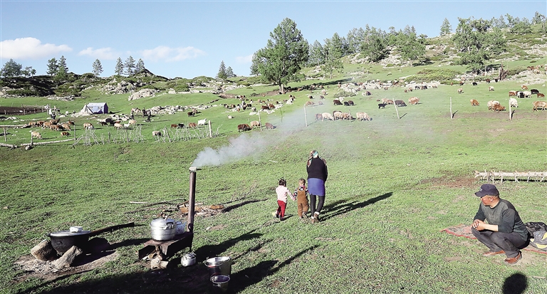 帐篷外,羊哼马鸣,有马提琴相伴;炊烟已起,有天蓝水蓝、地绿山绿相陪;牧民与羊马牛、青山绿地和岁月共守。