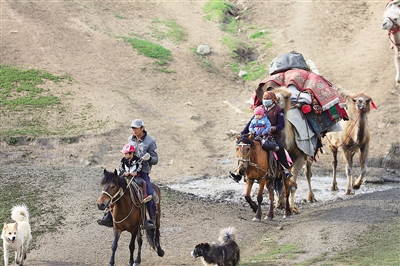 牧民们骑着马、牵着骆驼,骆驼驮着毡房和桌椅、锅碗瓢盆、电视等全部家当,就这样,日出而行,日落而歇。他们要走上两至三天。在路上,伴着云雨和犬吠、羊叫、马鸣、牛吼的声音,夫妻二人挥鞭吟唱,生活简单又实在。