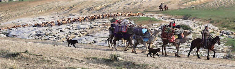 早上5点28分,阿拉哈克乡阿热勒村的阿克力拜山和他的妻子库力曼带着372头羊、4匹马和3只骆驼出现在山头。最先出现在山头的是和他们相伴五年的两只牧羊犬。犬在羊群前后不停地跑着,如果遇到了乱石挡路、山沟、河流,两只狗都会大叫。有离群的羊,两只狗会合力把它们赶回羊群中。