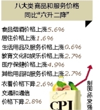八大类商品和服务价格环比“三降二平三升”。其中,食品烟酒价格下降0.4%,衣着价格下降0.6%,生活用品及服务价格下降0.2%;居住价格上涨0.3%,医疗保健价格上涨0.3%,其他用品和服务价格上涨0.4%;交通和通信价格、教育文化和娱乐价格持平。