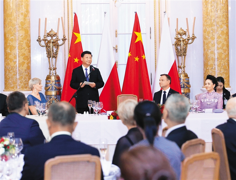 习近平在致辞中强调,波兰文化丰富灿烂,人民热情好客,国家蓬勃发展。中波两国人民友谊源远流长。早在第二次世界大战期间,波兰功勋飞行员乌尔班诺维奇将军曾在中国参加抗战,傅拉都医生不远万里远赴中国支持我们的抗日战争。波兰是首批承认并同新中国建交的国家之一,为新中国恢复建设提供了大量帮助和支持,中国人民对此铭记在心。当前,中波两国政治互信更加牢固,互利合作蓬勃发展,各领域交往日益密切,为两国和两国人民带来了实实在在的利益。中波关系已经发展到新的历史阶段,也面临着新的历史机遇。中方愿同波方以建立全面战略伙伴关系为契机,在相互尊重、平等互利基础上,承前启后、继往开来,加强战略对接,深化务实合作,共同开辟中波关系更加美好的未来。