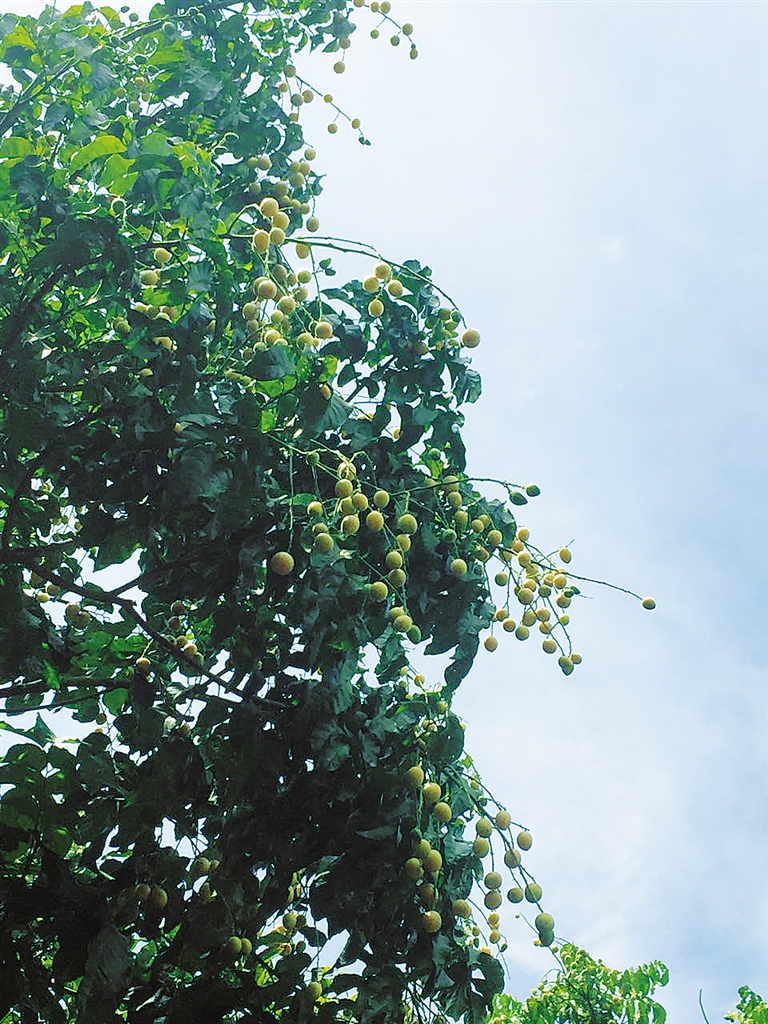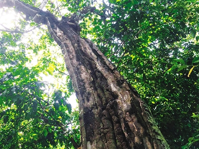 南吉村种植黄皮历史悠久,被誉为海南百年黄皮园。这个说法并不夸张。走进南吉村百年黄皮园,远远就能看到一株长得又扁又薄的黄皮树:一面是粗糙的树皮,一面是裸露的褐色树干,但是,上面还是挂着一串串青黄色的黄皮果子。