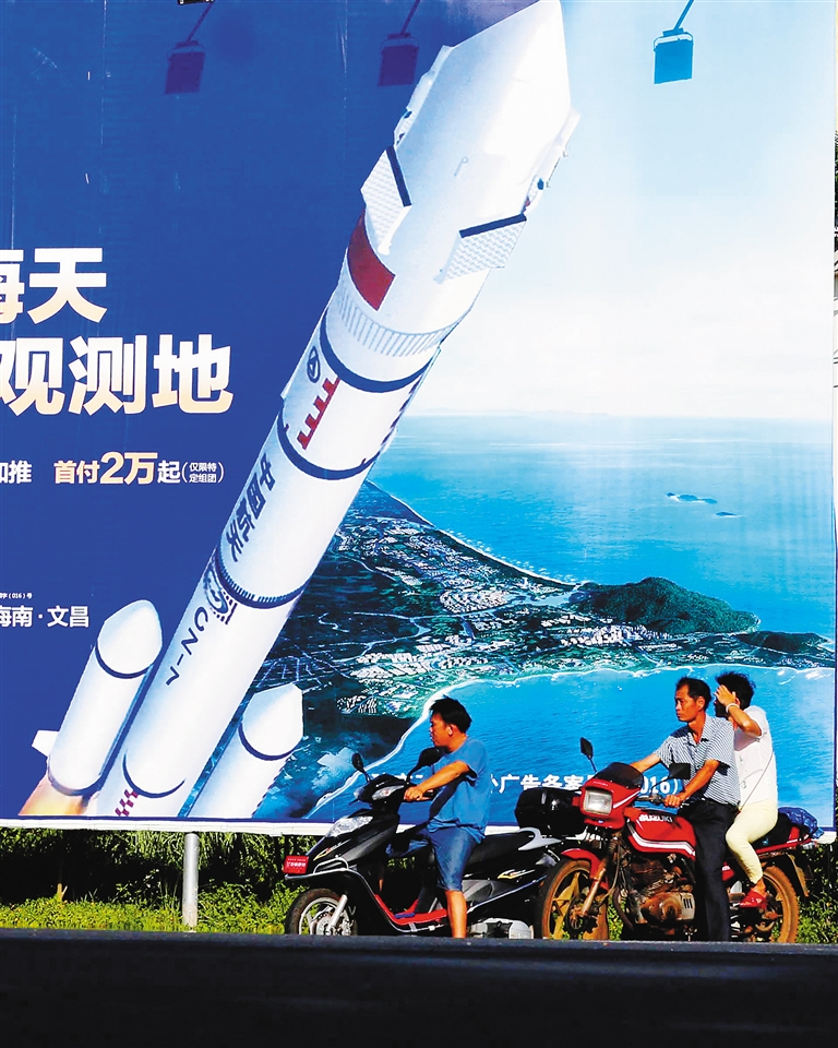 文昌清澜大桥上的火箭首飞宣传画。本报记者 陈元才 摄