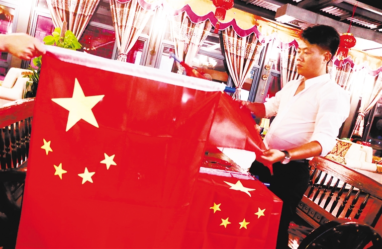 文昌龙楼镇一酒店工作人员正准备悬挂五星红旗。本报记者 张杰 摄