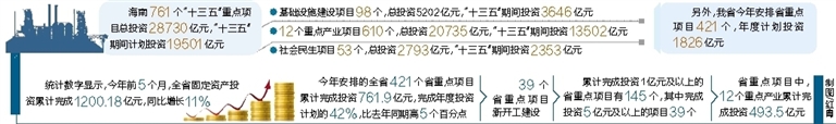在这些项目中,今年以来,三亚新机场项目(填海工程)、桂林洋国家热带农业公园项目、海南西部中心医院二期及配套设施项目、南海佛学院、文昌航天发射中心入口旅游配套设施项目等一批重点项目新开工建设;海南生态软件园项目、海口观澜湖项目、儋州白马井海花岛旅游综合体项目、三亚凤凰岛整体开发项目、海棠湾国家海岸旅游度假区等一批项目处于主体施工阶段;海口市旧城改造项目、儋州白马井海花岛旅游综合体项目、万宁至洋浦高速公路、电网建设与改造工程、海口大英山开发项目、海南移动信息基础设施建设项目等一批项目完成投资超过5亿元。