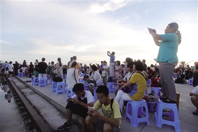 17时许,距离火箭发射还有3个小时,记者驱车前往龙楼镇希尔顿酒店前的海滩,这里早已是人头攒动。