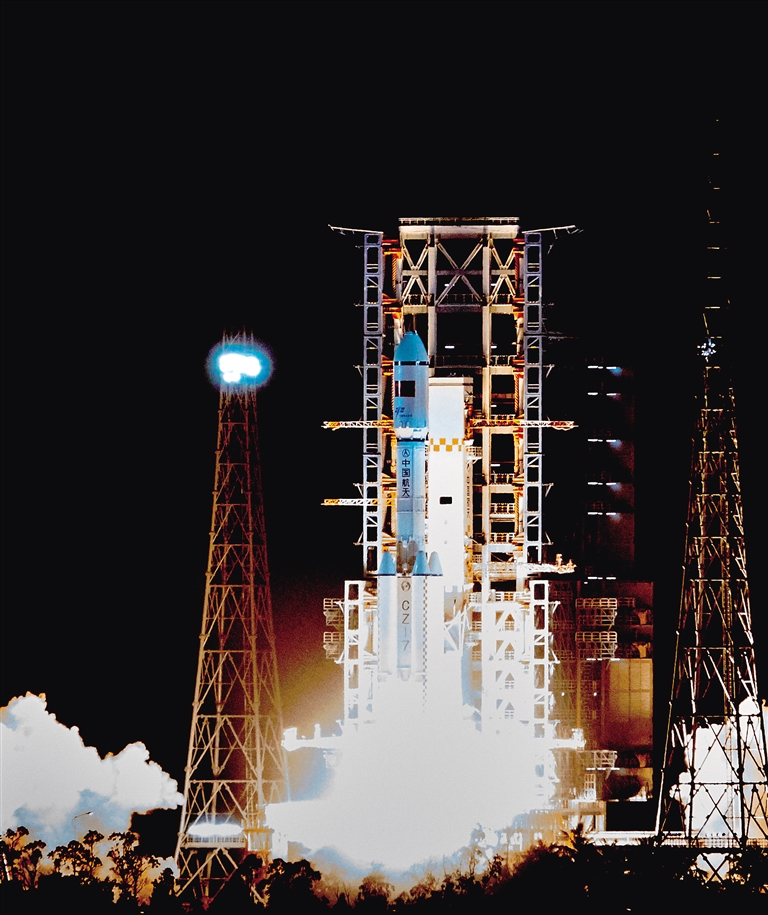 20时整,伴随着震耳欲聋的巨大轰鸣声,长征七号腾空而起,拖曳着一束耀眼夺目的白色烈焰,在海天之间划出一道绚丽的轨迹,飞向无垠的星空。