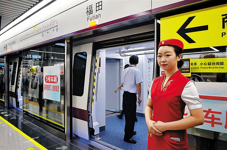 6月28日,工作人员在深圳地铁11号线福田站站台迎候乘客上车。 当日,深圳地铁11号线开通试运营。11号线全长51.9公里,东起福田枢纽,西至碧头站,途经机场,这是深圳机场新航站楼2013年11月启用后,首次接通直达地铁。11号线正式运营后,从广深港高铁福田站至深圳机场站乘车时间约30分钟。新华社记者 毛思倩 摄