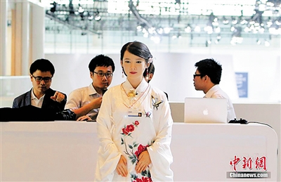 6月27日,参加2016天津夏季达沃斯论坛的嘉宾被机器人“佳佳”逗得开怀大笑。在本届达沃斯论坛上,由于高强度工作,“佳佳”有点过度疲劳,身体有点小小的毛病,眼睛只能“凝视”,不能“抛媚眼”了。“佳佳”是一位高颜值机器人,由中国科学技术大学研发,是中国首台特有体验交互机器人。 (中新)