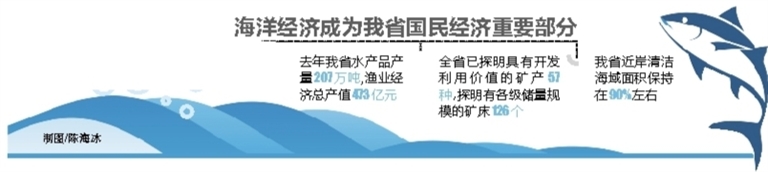 200多万平方公里的海域面积孕育了海南丰富的生物、油气和矿产资源。去年我省水产品产量207万吨,渔业经济总产值473亿元;全省已探明具有开发利用价值的矿产57种,探明有各级储量规模的矿床126个。海洋经济已成为全省国民经济的主要组成部分和重要的经济增长点。与此同时,我省海洋生态环境保持良好,近岸清洁海域面积保持在90%左右。