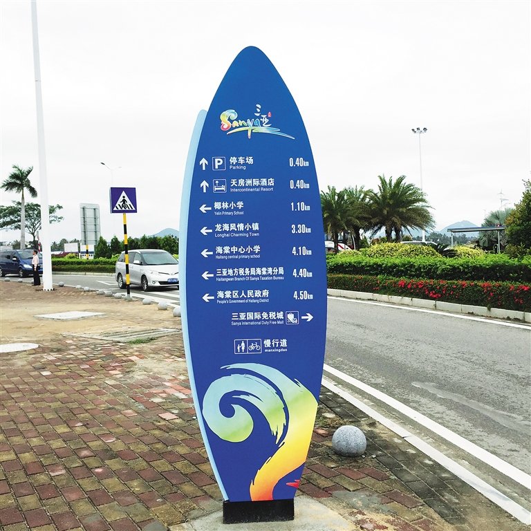 三亚慢行道导向标识牌投入使用后,国内游客称赞方便贴心,美观实用,尤其是信息内容里的图标和离下一个地点的具体距离,让游客对自己的位置和交通方式的选择清晰明了。英文说明给国际游客带来便利。参加导向系统改造的某公司负责人说:“三亚慢行道导示系统项目总共有帆船形、酒店、扇形、停车场四个造型,今年1月,我们就四个造型申请了专利并已受理。考虑三亚多台风多雨,潮湿闷热,采用了不锈钢折弯焊接烤漆、丝印、三角加强筋焊接等新工艺。”