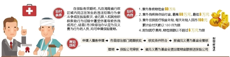 据了解,保费的来源主要以省财政预算资金为主,省见义勇为基金会基金、各市县见义勇为工作部门基金(资金)和社会各界爱心人士捐款为补充。《办法》规定2016年保险的赔付内容有四项:一是意外身故赔偿金。在保险期限内,被保险人因见义勇为而遭受伤害事故,并自事故发生之日起180日内所致死亡,保险人给付人民币60万元身故保险金;