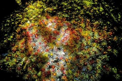 七里村的玉蕊林绕村生长,村边一条小河穿林而过,汇入北门江;盘根错节的玉蕊树沿着水流生长,水纹上偶有飘浮几朵淡粉色流苏状的玉蕊花儿,树冠遮阴蔽日,光斑隐现,颇有桃花源中落英缤纷之感。有不少村民在这片林子里纳凉午休,风从树梢走过,好不凉快。