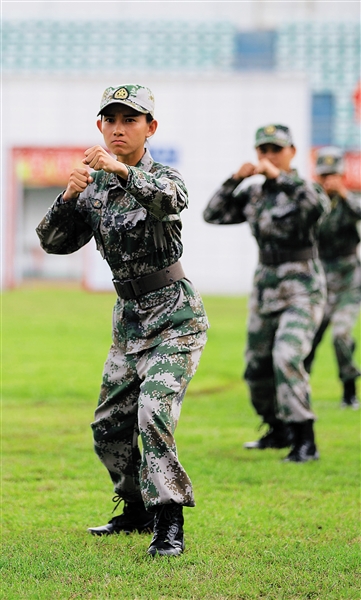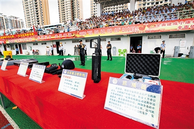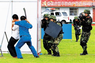 上午9时,陵水县公安、边防、消防、武警、森警、铁警等多警种近500人全副武装列队完毕。10时整,实战汇报演练开始。陵水公安边防支队官兵首先展示盾牌警棍术。盾牌和警棍是警方防暴应急队伍日常装备的防护器材,在处置群体性突发事件中可以有效保护人员和重要目标,警棍进可攻,盾牌退可守,两者配合可以有效打击和驱散闹事暴徒。边防官兵左手盾牌右手警棍,随着口令左右攻守兼备。