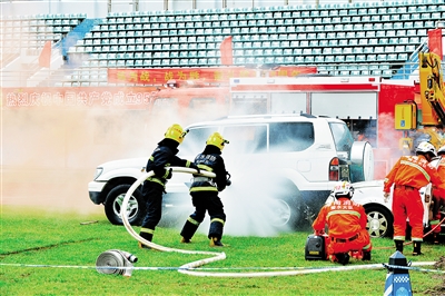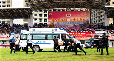 在活动现场,陵水县武装部民兵应急分队女子排表演了擒敌拳,踢、打、摔、擒,女民兵们或单兵突击,或两两配合,展示了一招制敌的过硬本领。在交通指挥手势演练中,陵水交管大队民警以集体方式进行表演8种交通指挥手势,极力展现交通指挥手势的美感。在交通事故灭火抢险救援科目演练中,陵水公安消防大队、县公安局交管大队、县120急救中心演练人员坚持“迅速出动,及时救人,控制燃烧,防止爆炸,适时灭火”的原则,合理使用各类破拆工具破拆车体,营救被困人员。在群体性事件处置演练中,应急处突警力坚持教育疏导、果断稳妥、依法处置、慎用武器警械和强制措施的原则,及时反应,迅速到达现场,展开设置警戒地段,政策宣传,警用直升机空中侦察指挥,强行驱散“闹事人群”,穿插带离闹事骨干分子,最后平息事态。