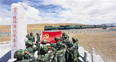 6月30日,武警西藏总队那曲支队战士在世界铁路海拔最高点5072米纪念碑前重温入党誓词。 当日,武警西藏总队那曲支队6、7中队的执勤官兵,在世界铁路海拔最高点5072米纪念碑前开展重温入党誓词活动,庆祝中国共产党成立95周年。