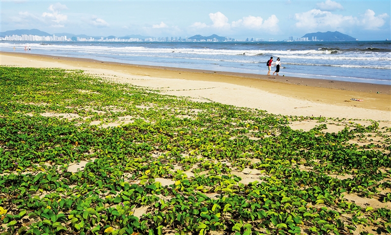 6月30日,三亚湾海坡段,补种的原生植被马鞍藤长势良好,它们覆盖沙滩,起到护沙固沙的作用。