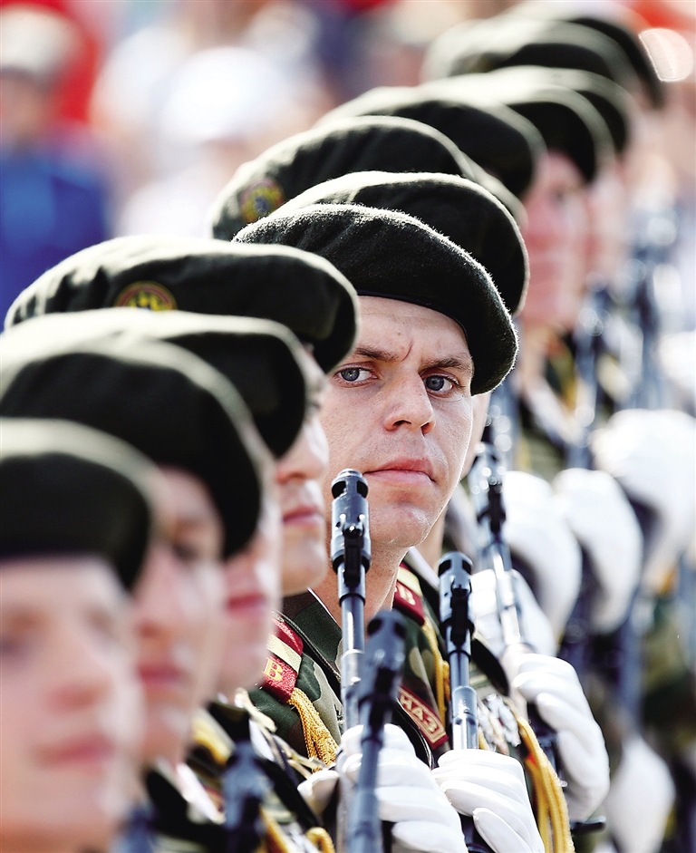 7月3日,在白俄罗斯首都明斯克,士兵参加庆祝国家独立日阅兵式。 当天是白俄罗斯国家独立日。新华社/路透