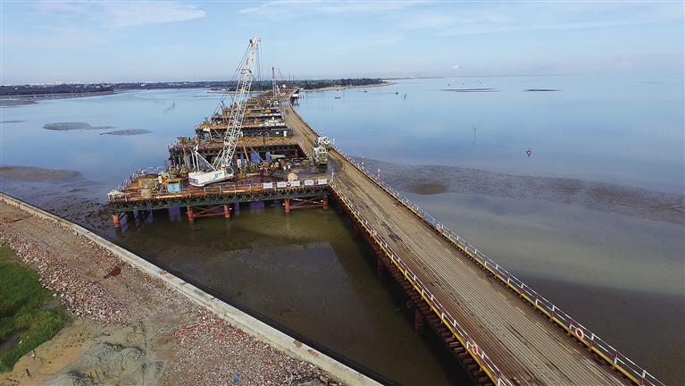 文昌铺前大桥项目是我省迄今为止规模最大的独立跨海桥梁工程。项目总投资30亿元,目前已完成投资约7亿元,项目工地建设基本完成,临时便桥已建设完成,32根主桥桩基已完成9根,引桥桩基完成140根。本报记者 张杰 摄