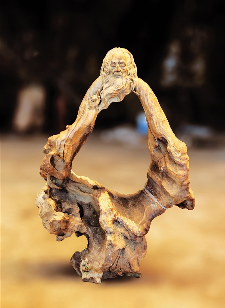 “枯木看似无用,我们要做的就是赋予它们生命”所讲的就是“三分人工”了。吴孔德说,“雕刻,要保留根材的肌理绺花与盘错瘿疖,时刻考量根雕造型的空间体量、曲线过渡、体面转换,这是基础。创作中,要试图与人物对话,体现人文之精美,让人物在枯木之上复活苏醒。”