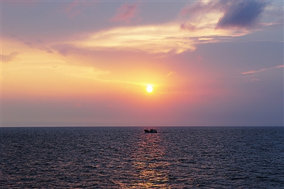 蔡华文是三沙市海事局的一位工作人员,他在投稿来信中说,拍摄照片时,自己正在永乐群岛海域的旅游船上开展西沙旅游航线现场监管工作。当时正值傍晚时分,热浪还未退去,斜阳西下,放出万丈金光,此刻的南海静谧温柔,勤劳的西沙渔民正在海上捕鱼,蓝海、云层、斜阳、渔船和谐共处,非常震撼。
