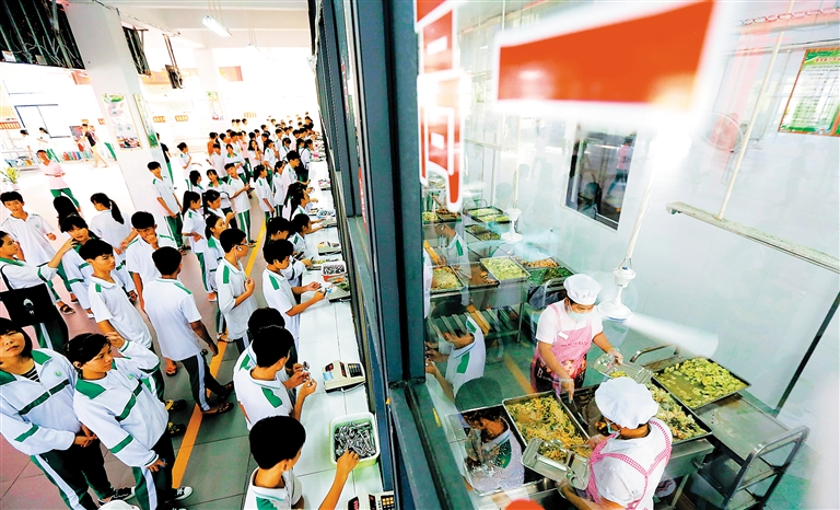 近日,在屯昌思源实验高级中学食堂里,学生们在干净整洁的餐厅里排队就餐。据介绍,该校食堂因管理规范,卫生良好,环境舒适等被省食品药品监督管理局、省教育厅正式挂牌“省级食品安全示范学校食堂”。