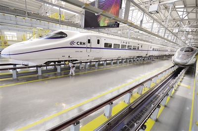 7月4日,机械师在西安铁路局西成动车组检修库检查动车车体。 近日,西安铁路局西安动车段西成动车组检修库建成并投入试修运行,这使得西安铁路局动车组运用检修能力达到10线20列位,存车线总规模达48条,成为我国西部规模最大、功能最先进、建设标准和现代化程度最高的动车组检修基地。新华社发