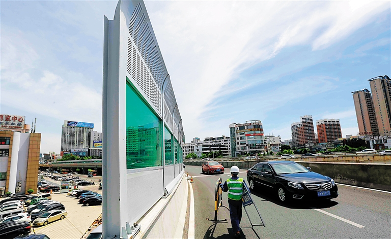 7月4日,在海口市海秀快速路南大桥段,部分路段已经安装了隔音板,以减弱城市噪音污染,减少汽车噪音对道路两边居民的困扰。随着海秀快速路通车的时间临近,各种相关的配套也在逐步地完善。