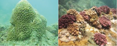 2015年,共鉴定出珊瑚12科52种,造礁石珊瑚覆盖度平均值为21.4%,其中,鹿回头和西岛海域平均覆盖度较高,小东海海域最低。珊瑚补充量平均值为1.40个/平方米,其中鹿回头海域珊瑚补充量最高,达到1.90个/平方米。2015年保护区内的珊瑚覆盖度和补充量与2014年相比均有所提高。