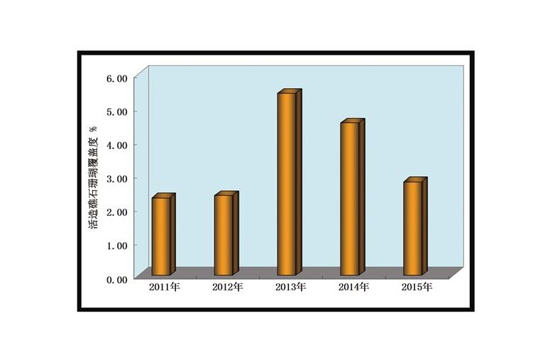 2011年~2015年海南岛东海岸造礁石珊瑚覆盖度基本保持稳定,珊瑚补充量有回升的趋势。