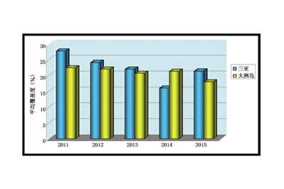 2011年~2015年,三亚自然保护区造礁石珊瑚的平均覆盖度呈总体下降趋势,2015年略有回升。万宁大洲岛自然保护区造礁石珊瑚的平均覆盖度变化不大。