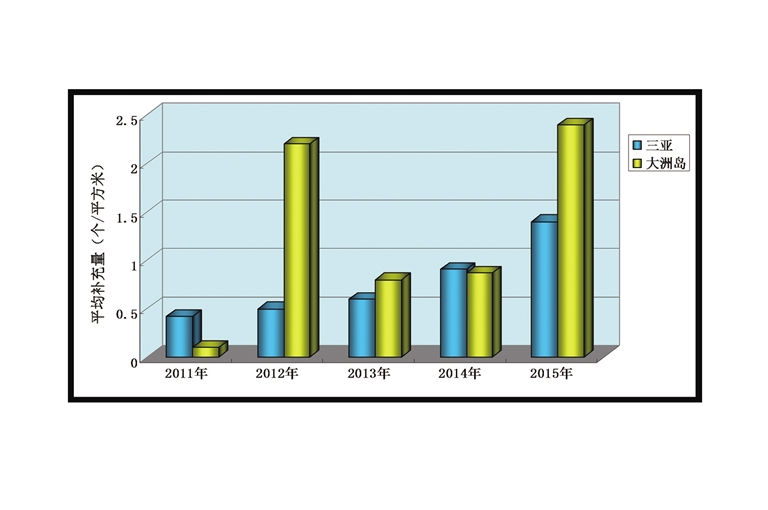2011年~2015年,三亚自然保护区造礁石珊瑚的年平均补充量呈逐年递增的趋势,2011年为0.42个/立方米,2015年为1.40个/立方米。万宁大洲岛自然保护区造礁石珊瑚的年平均补充量呈波动上升的趋势。