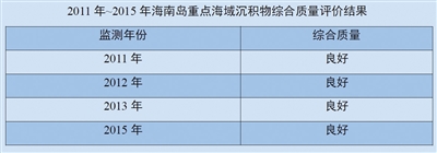 2011年~2015年,海南岛近岸海域海水环境状况保持优良,水质均符合第一类或第二类海水水质标准。