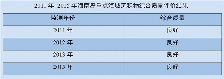 2015年,海南岛近岸海域开展了冬季、春季、夏季和秋季四个航次的海水质量监测,海水中无机氮、活性磷酸盐、化学需氧量和石油类等要素的综合评价结果显示,海南岛近岸水质优良,均符合第一类海水水质标准。