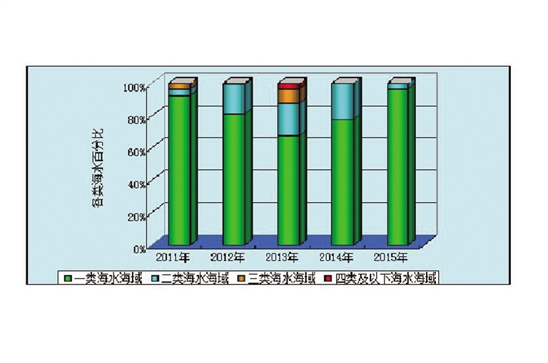 2011年~2015年,海南岛重点海域海水水质总体优良,第三类、第四类及劣于第四类海水水质标准的海域面积比例维持在较低水平,第一类海水海域的面积呈现上升趋势。
