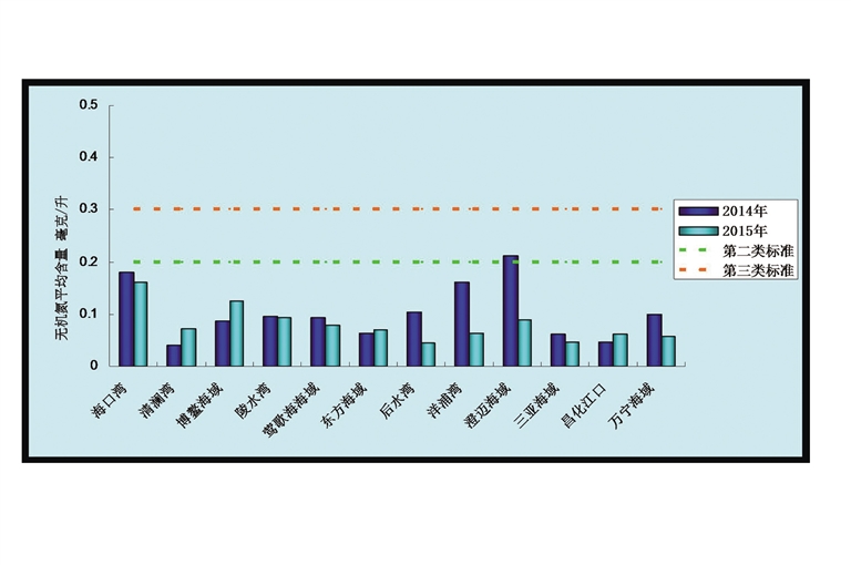 常见污染要素含量比较 近年来海南岛各重点海域最常见的污染要素是无机氮。2015年文昌清澜湾、琼海博鳌、东方、昌江昌化江口海域的无机氮平均含量比2014年有所增加,其它海域均有不同程度的减少。