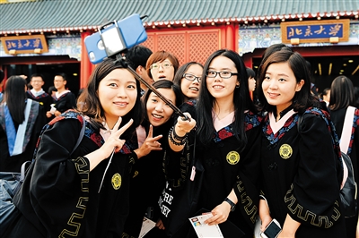 7月5日,几位北京大学毕业生在毕业典礼前自拍留念。 当日,北京大学2016年本科生毕业典礼在北京大学邱德拔体育馆举行,共有三千多名本科毕业生参加毕业典礼和学位授予仪式。 新华社发