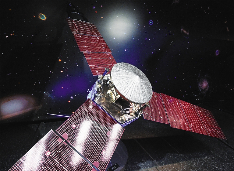 这是7月4日在位于美国加利福尼亚州帕萨迪纳的喷气推进实验室内拍摄的只有“朱诺”木星探测器五分之一大的模型。美国航天局确认,历经近5年飞行,“朱诺”于太平洋夏令时4日20时53分成功进入绕木星轨道。新华社/法新
