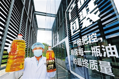 6月30日,在屯昌县西昌镇南熙村榨油厂,工人展示特色产品。该村去年引进了一家自动化、标准化的榨油厂,主要生产海南特色山柚油及花生油,不仅带动该村的村民利用闲置土地种植山柚和花生,还成为该村乡村旅游资源的一部分。