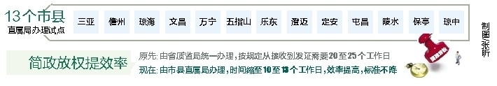 省质监局有关负责人说,推进供给侧结构性改革必须坚持改革创新,逐步形成适应供给侧结构性改革的体制机制,完善推进供给侧结构性改革的保障措施,最大限度激发和调动各方面积极性创造性,释放经济发展新活力,努力营造公平公正的市场竞争环境。行政审批制度改革是政府职能转变的一项重要措施和简政放权改革的突破口,为适应经济新常态下的发展需要,加快简政放权步伐,通过权力下放更好地服务企业。2015年12月,省质监局正式在三亚质监局和澄迈质监局启动行政审批制度改革试点,以行政委托的方式,将重要工业产品生产许可证核发、机动车安全技术检验机构资格许可等11项由省级质监行政机构承担的行政审批事项,交由设在市县的直属局办理。