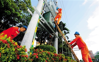 7月7日,在屯昌县屯城镇,电网工作人员对电网设施进行改造,优化电网结构。据了解,“十三五”期间,全省统调负荷预计将保持中高速增长,海南电网将投资178亿元继续加强电网升级改造,打造更加坚强可靠的电网,满足海南经济社会发展和人民生活用电需求。