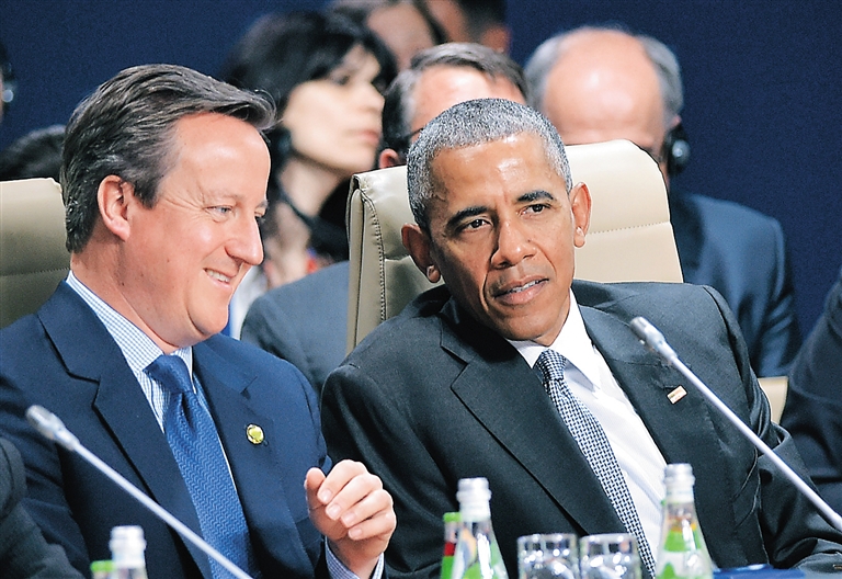 7月9日,美国总统奥巴马(右)与英国首相卡梅伦在波兰华沙出席北约峰会。 北约峰会8日下午在波兰首都华沙开幕。为期两天的会议将主要围绕北约在中东欧的军力部署、与伙伴国的安全合作、与欧盟的合作三大议题展开。 新华社/法新