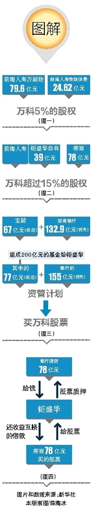 第一步,主要是用前海人寿的保险资金购买,共斥资104.22亿元,其中包括万能险账户保费资金79.6亿元和传统保费资金24.62亿元。根据公开披露,截至去年7月11日,前海人寿持股万科比例达到5%。(见图一)