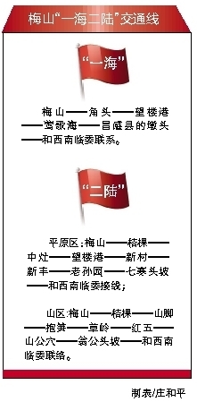 梅山地处崖县区域(今三亚、乐东、东方一带,编者注)中心,面临大海,背靠大山,山高林密,无论水上还是陆地,进可攻,退可守,既容易隐蔽,又能出奇制胜,特别是这里的群众基础好,是个开展游击战的好地方。从梅山到西南临委(今东方市),全程约有100多公里之遥,而且沿途平原有日军设防布守;山区更有敌伪军驻扎巡逻,真是四邻多垒,岗哨林立,荷枪实弹,戒备森严。但是梅山乡党支部紧紧地依靠人民,神秘般地开辟出“一海二陆”的交通线。“一海”:即梅山—角头—望楼港—莺歌海—昌感县的墩头—和西南临委联系。“二陆”(平原区和山区)。平原区:梅山—桔棵—中灶—望楼港—新村—新丰—老孙园—七寒头坡—和西南临委接线;山区:梅山—桔棵—山脚—抱笋—草岭—红五—山公穴—翁公头坡—和西南临委联络。总称:“一海二陆”交通线。