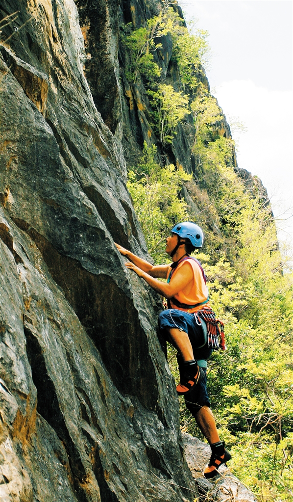 2006年,“海鸥”和一群户外运动伙伴报名参加了在省外举行的攀岩培训班,系统全面地学习了包括线路观察、保护站建设、安全保护等攀岩技巧,并考取了攀岩教练资格证书。自那时起,“海鸥”便不断寻找机会沿壁而“飞”。海南的攀岩场所比较少,他便飞到广西壮族自治区桂林市阳朔县,那是中国攀岩爱好者心目中的圣地。“阳朔那里有上百条攀岩线路。”“海鸥”回忆道,他忘不了月亮山山顶上,那天然溶洞所形成的巨大石拱;忘不了状似大拇指的拇指峰,也忘不了酒瓶山、铜门山、银子岩……